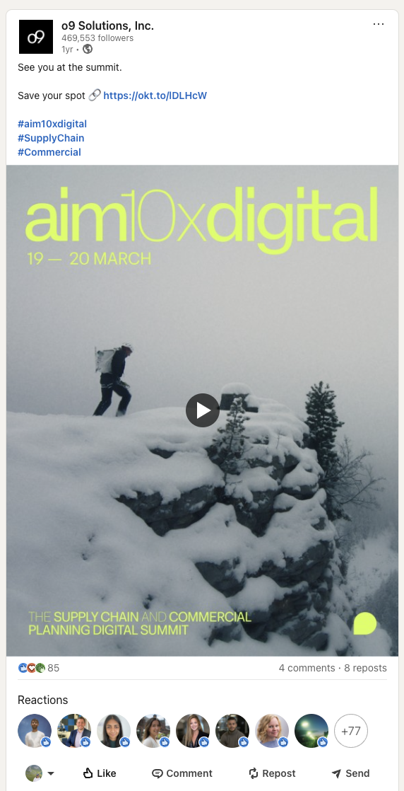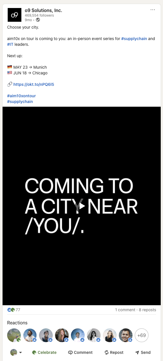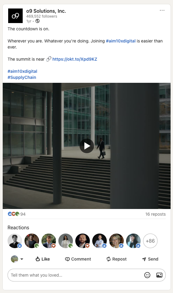 — o9’s president and COO, Igor Rikalo, recognized these efforts in an email to the team: “I really loved the 3.2.1. go post on LinkedIn. Great job, team! So grateful for everything you do every day to build an amazing and authentic brand.”