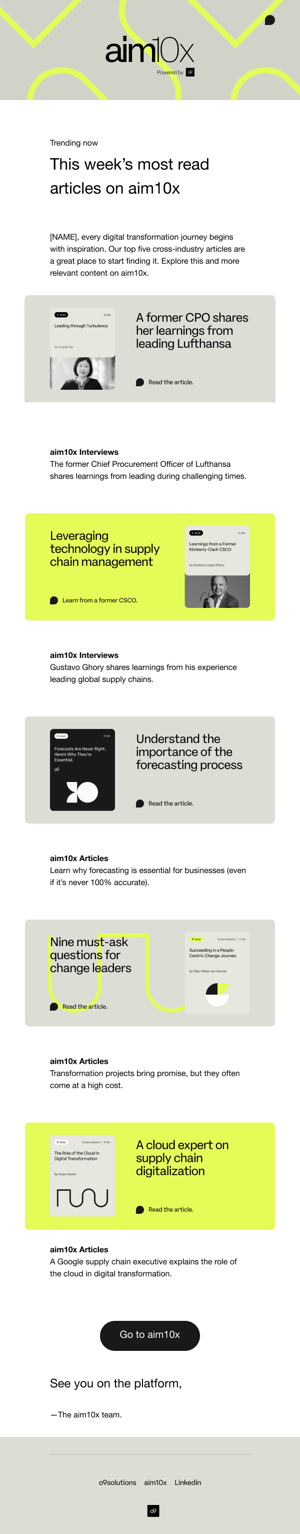 helped shape o9’s email strategy and voice across editorial and event campaigns, driving measurable gains in engagement and brand consistency.